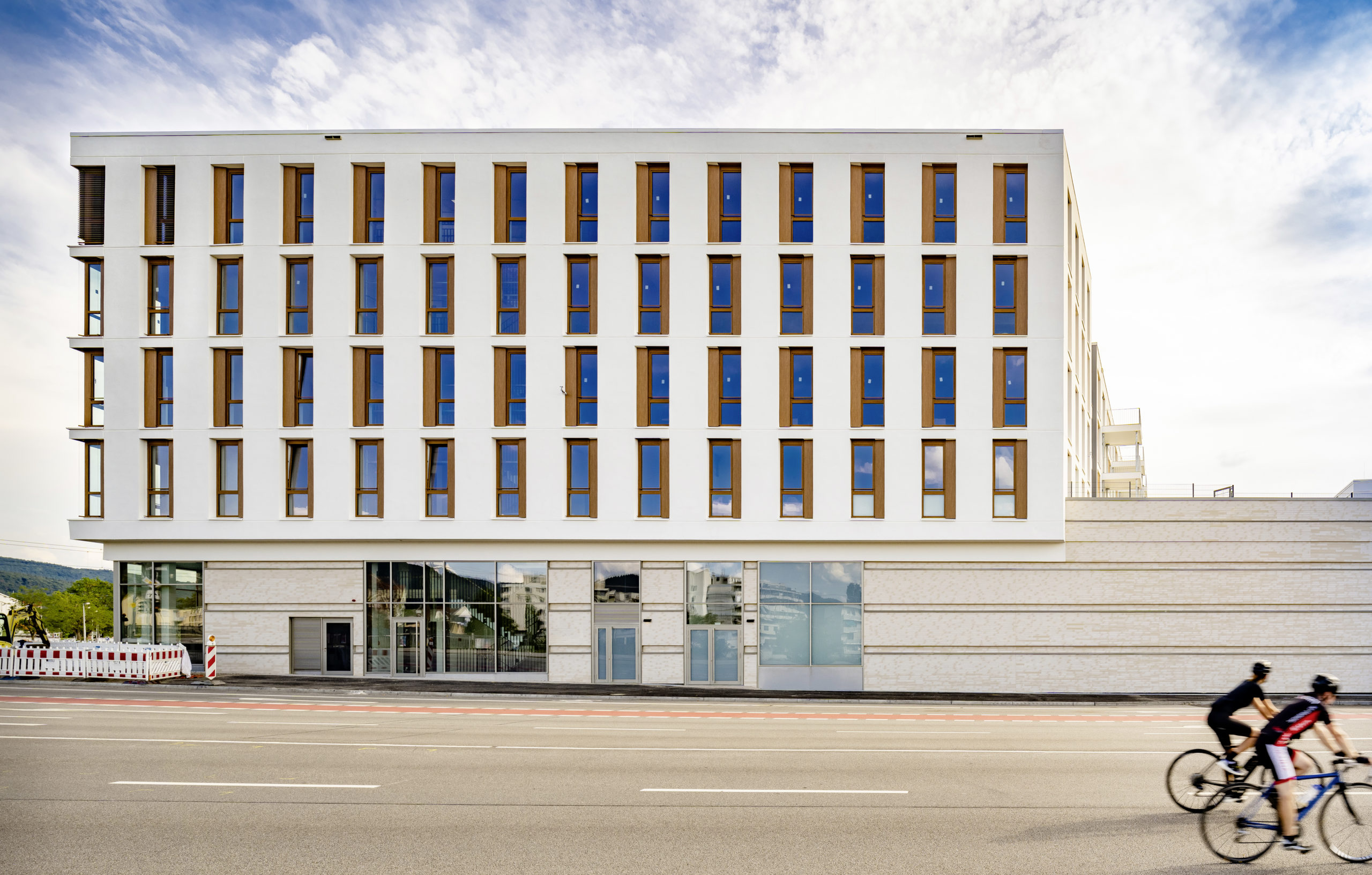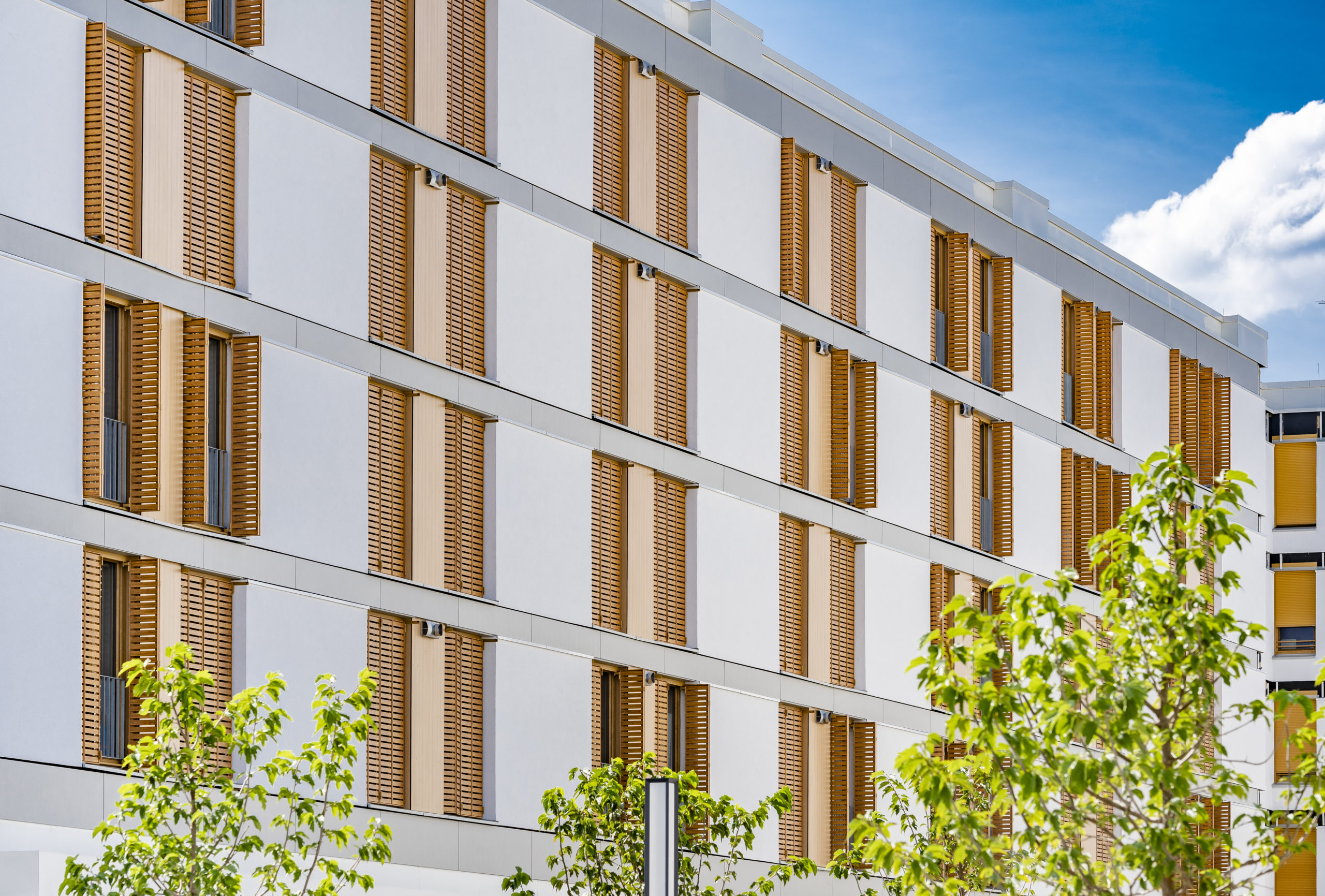 RONGE Fassadenbau war für die Herstellung und Montage der Gebäudehülle verantwortlich. Eingesetzt wurde unter anderem das Fassadensystem RoVisio FT mit verdeckter Bolzeneinhängung im Eloxal-Farbton C31. Die bis zu 3,17 m hohen und 1,98 m breiten Tafeln greifen das Fensterraster der Gebäude auf und verleihen der Fassade durch ihre Farbnuancen und den wechselnden Lichteinfall eine besondere Eleganz und Lebendigkeit. Ergänzend kamen weiße pulverbeschichtete RoVisio-Elemente als Untersichtsbekleidung zum Einsatz (max. 1,92 m Höhe, 1,98 m Breite).
