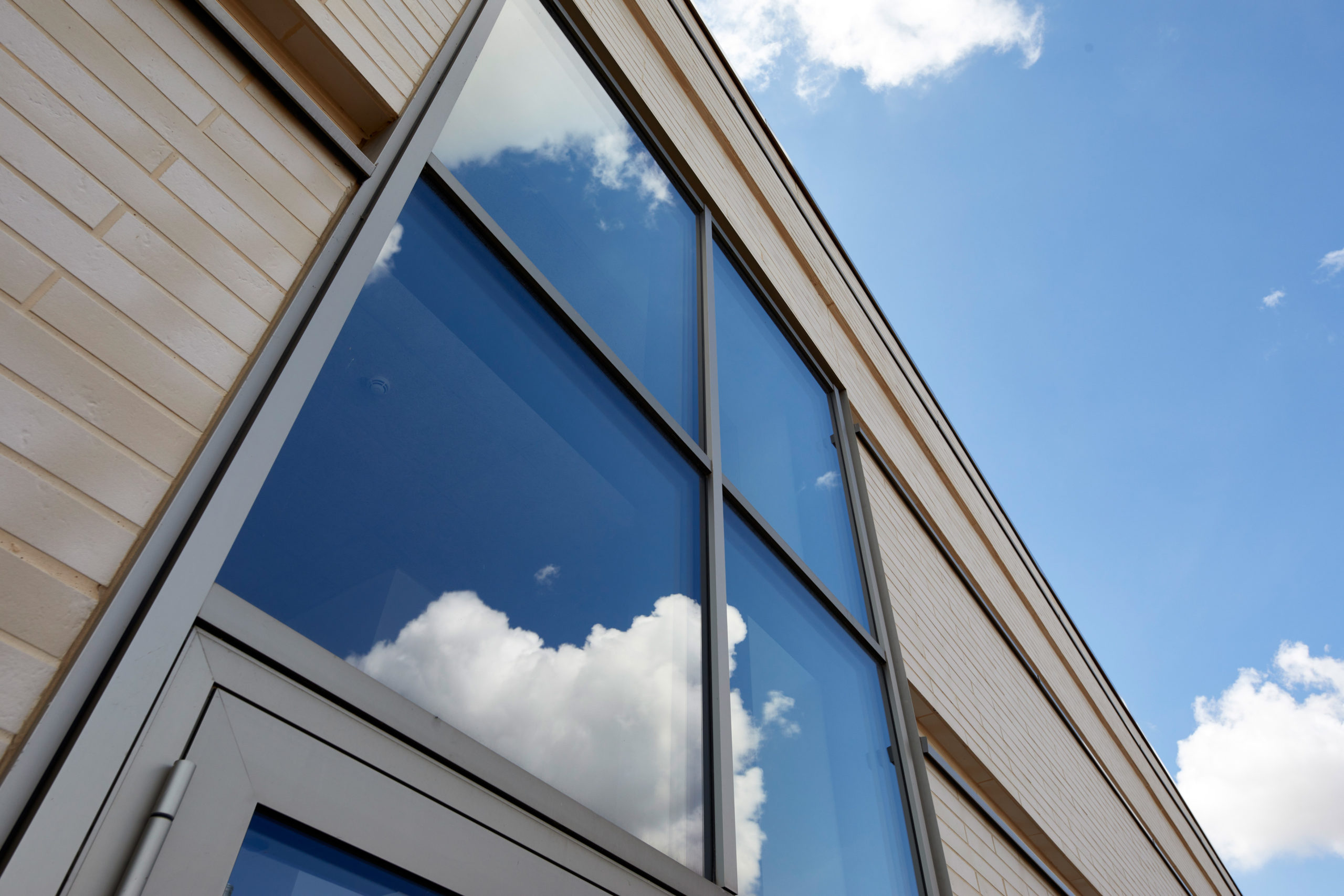 Darüber hinaus fertigte unsere eigene Produktion 14 Türen, teilweise mit Glasfüllungen, teilweise mit außenflügelüberdeckenden Paneelen, ausgestattet mit Panikfunktion oder Einbruchschutz RC2 – perfekt auf die Fassadengestaltung abgestimmt.