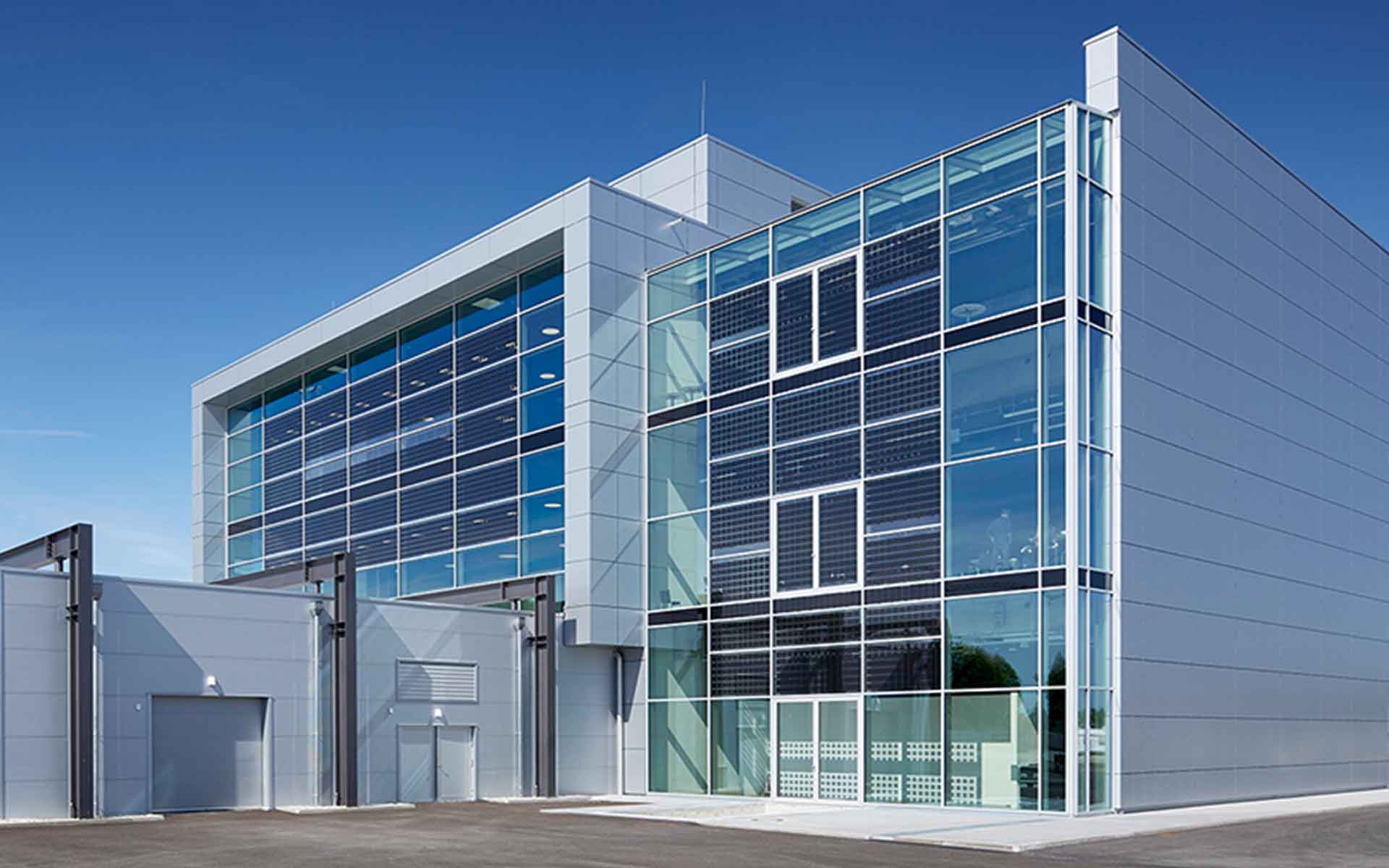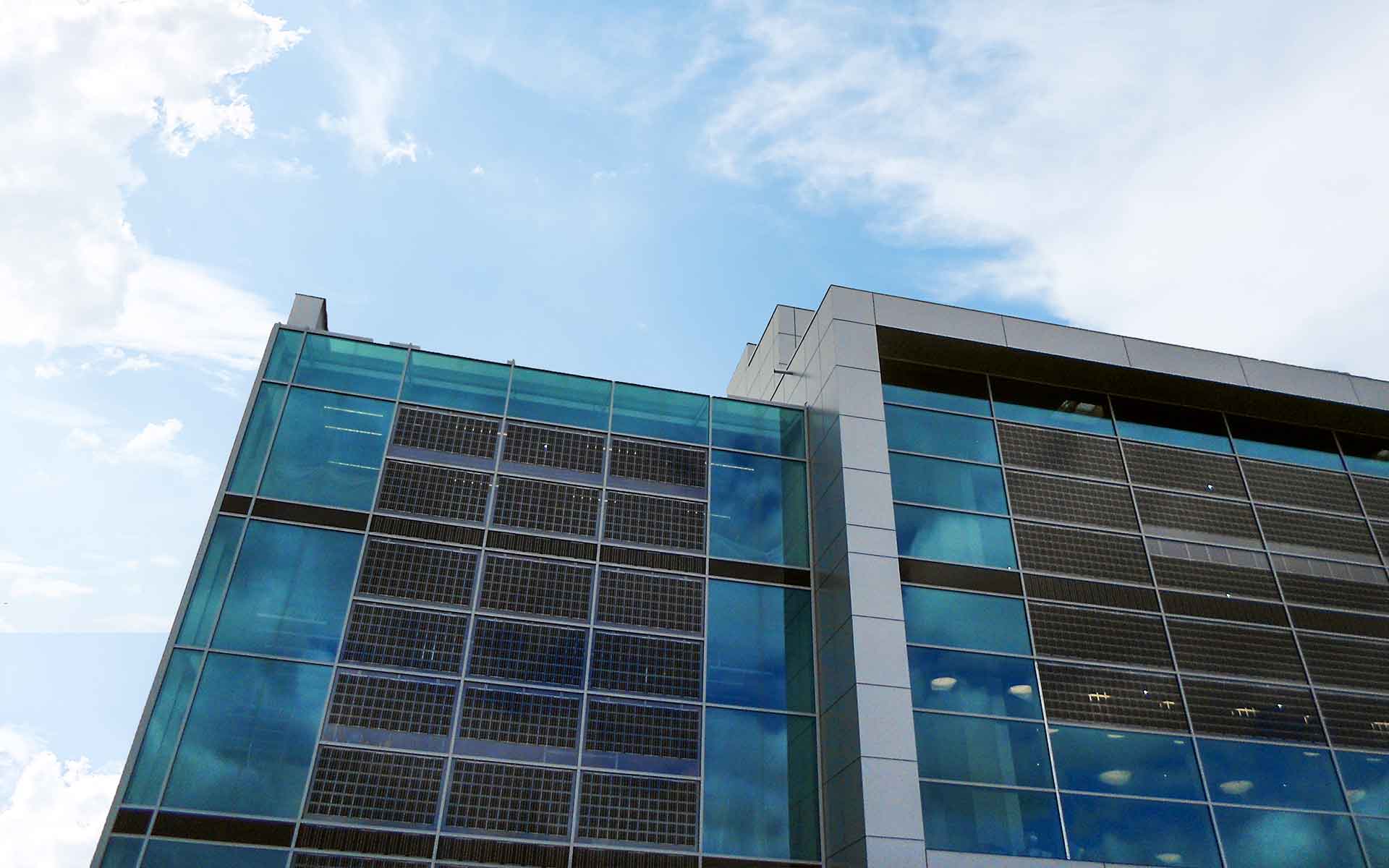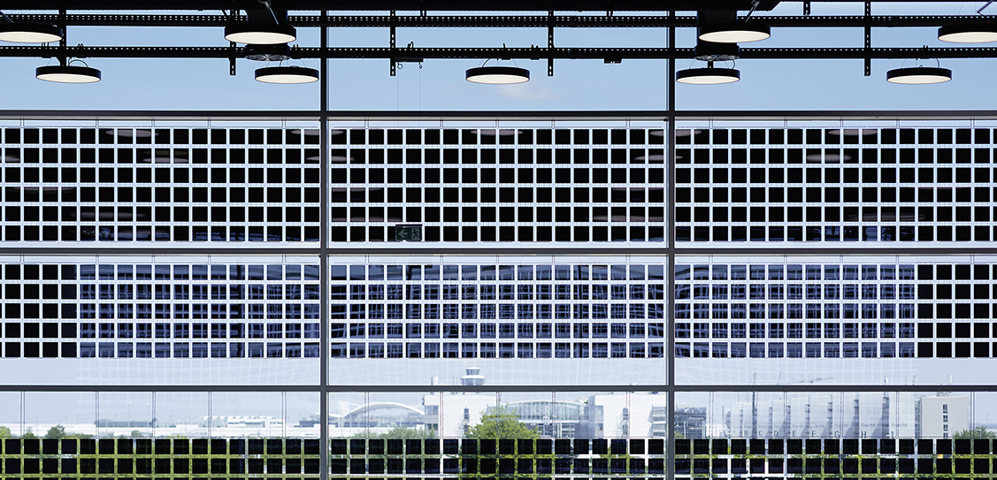 Zur Ost- und Westseite sind die Gebäudefassaden voll verglast. Die Besonderheit sind die insgesamt 450 Quadratmeter großen integrierten Photovoltaik-Elemente. 1.650 Solarzellen erzeugen hier jährlich 42.000 Kilowattstunden Strom für einen der größten Ladeparks Euroas.