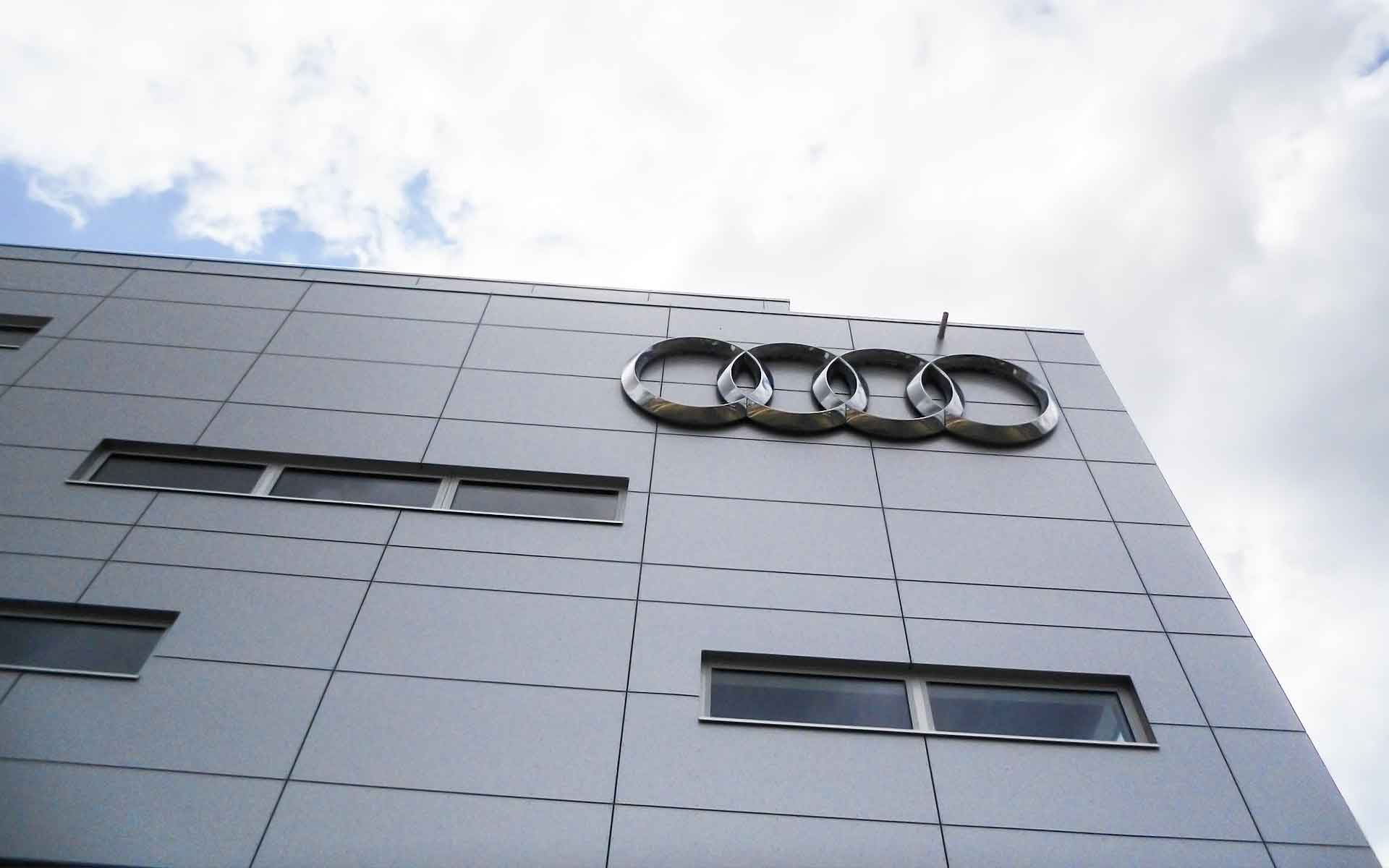 An Nord- und Südseite haben wir die moderne Optik der Fassade gemäß Ausschreibung durch Aluminium-Verbundplatten weiter aufgewertet. Zunächst nicht geplant, aber dann in Rekordzeit von RONGE Fassadenbau entwickelt und ausgeführt, war der Anbau im Westen des Gebäudes. In diesem Anbau erleben ca. 300 Besucher neue Technologien und Vorführfahrzeuge live. Neben Trapezprofildach plus Dachabdichtung haben wir hier ca. 300 m² ISO-Wand im Farbton ähnlich RAL 9006 ohne sichtbare Befestigung, Aluminiumtüren, Sektionaltore und Lamellenlüfter geplant, geliefert und montiert. Eine besondere Herausforderung war die nicht sichtbare Befestigung der vier AUDI-Ringe auf der Aluminiumfassade auf der Nordseite.