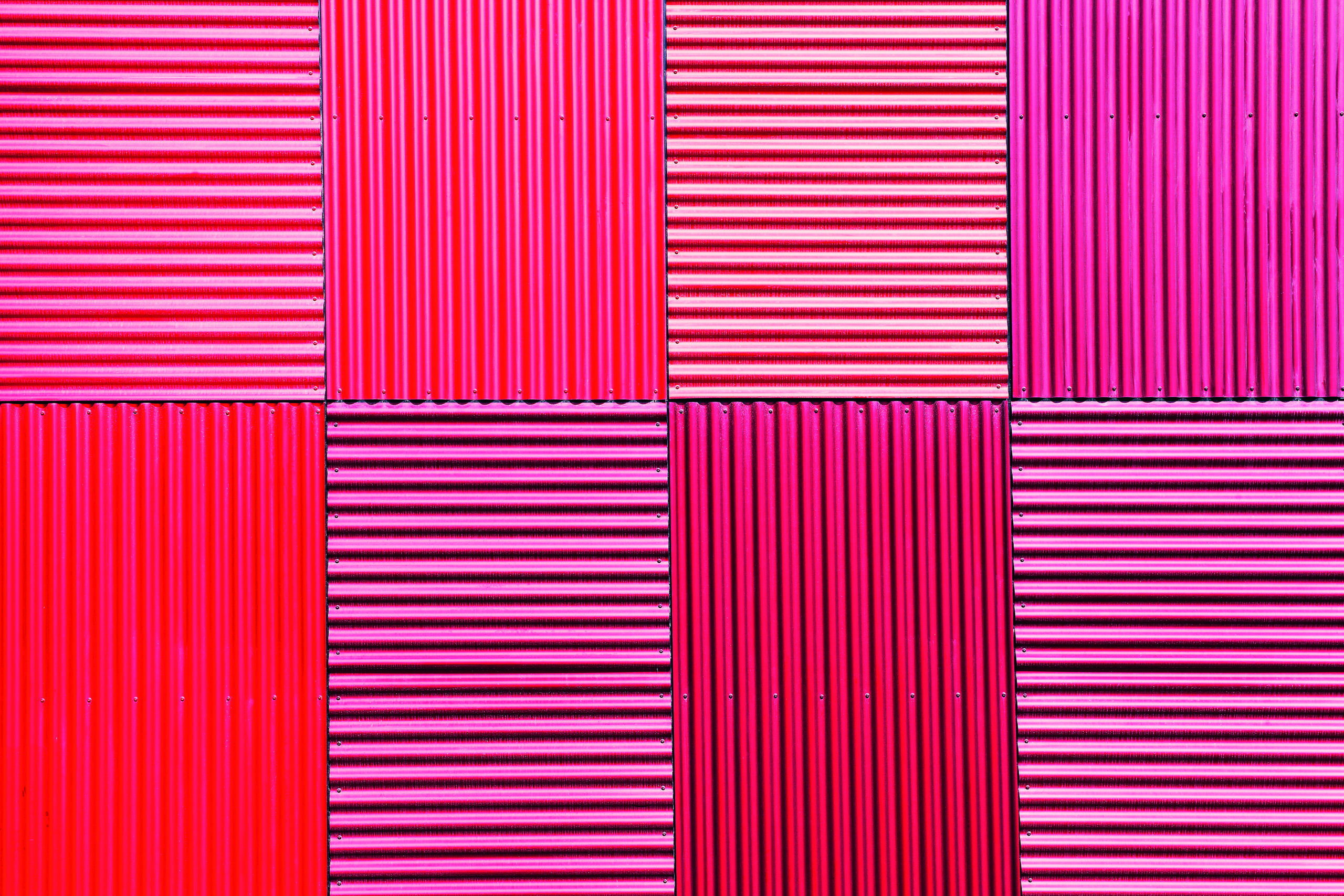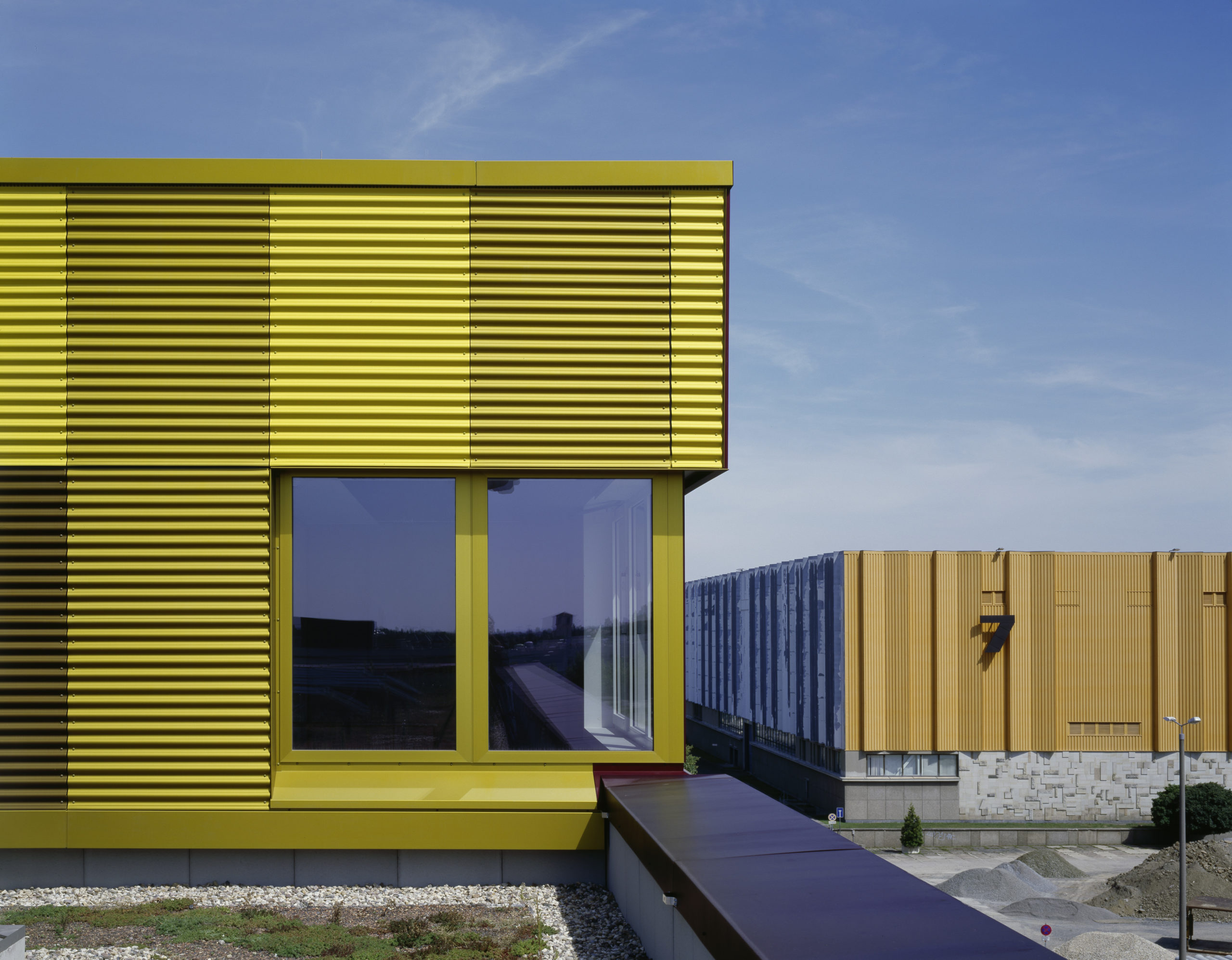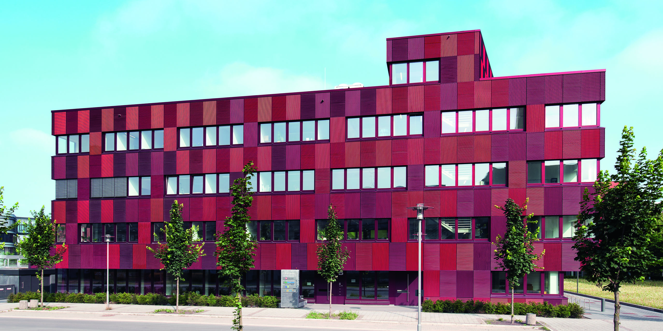 Vorgehängte, hinterlüftete Fassade aus farbeloxierten Aluminium-Welltafeln in zwei verschiedenen Farbtönen (rot, grün) und je drei unterschiedlichen Helligkeitsstufen.