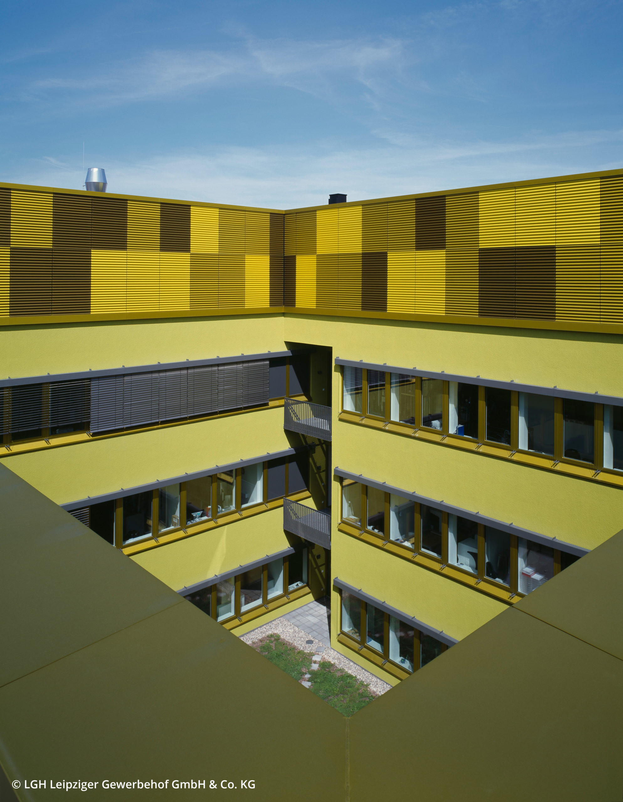 Die lebendige Farbgebung mit drei verschiedenen Rottönen ist für das Gebäude charakteristisch und fügt sich optimal in das Erscheinungsbild der BioCity Leipzig ein. Der Innenhof des BioCube wurde als Kontrast zur Außenseite mit Wellelementen in unterschiedlichen Grüntönen bekleidet.