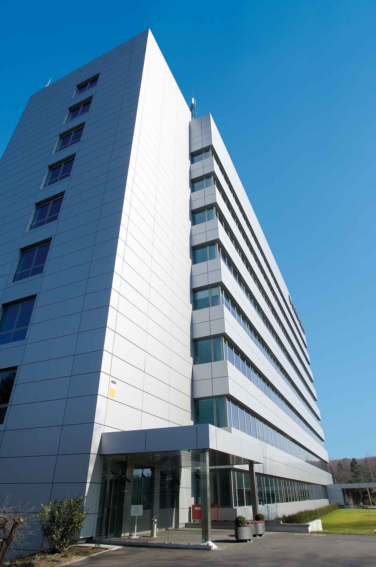 Für die neue Fassadenbekleidung wurde eine Vorgehängte Hinterlüftete Fassaden mit Aluminiumverbund-Elementen (RoSy +AV.FT) ausgewählt. Grund dafür war das geringe Eigengewicht des Werkstoffs, die glatte Oberfläche und die gute Selbstreinigungskraft.