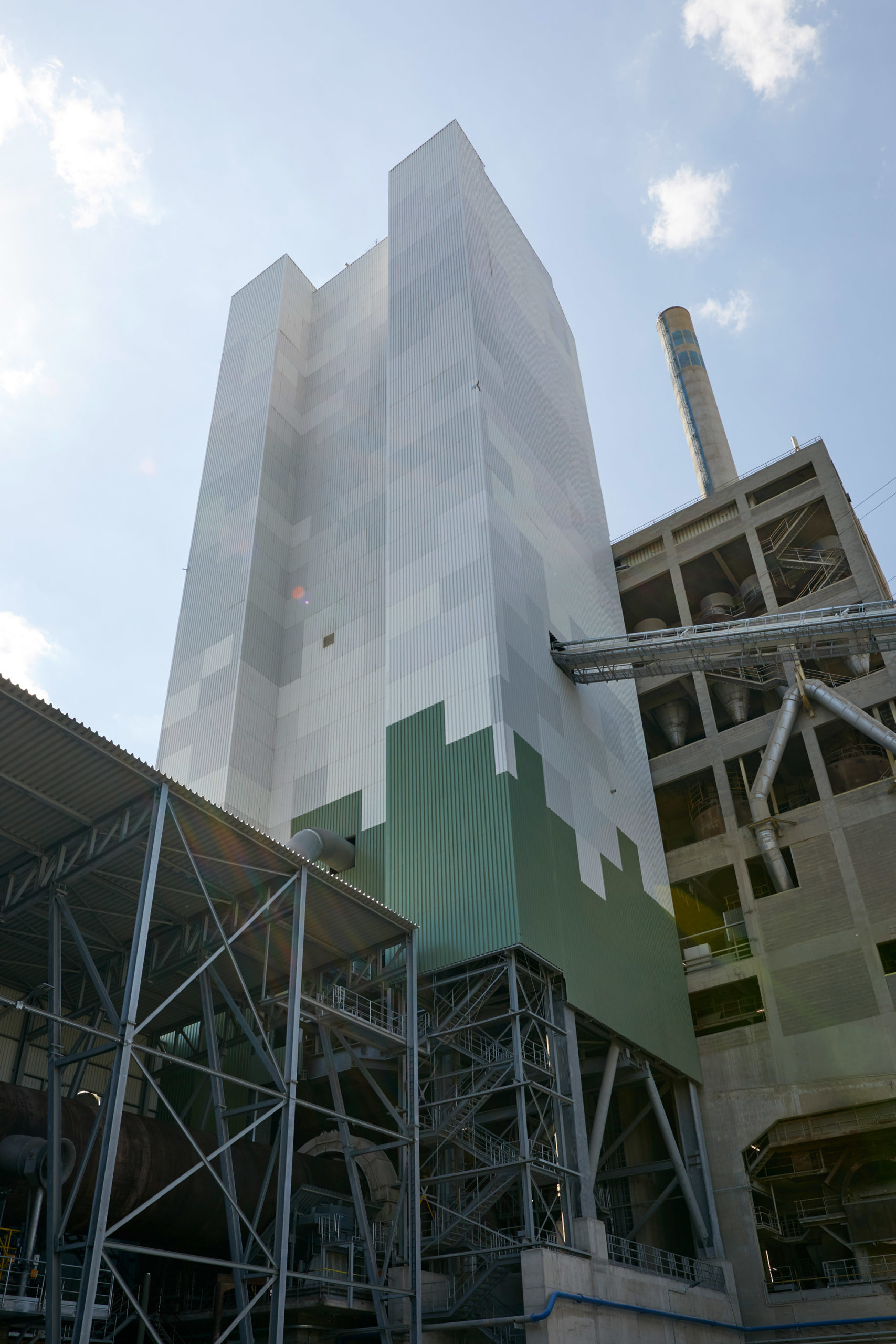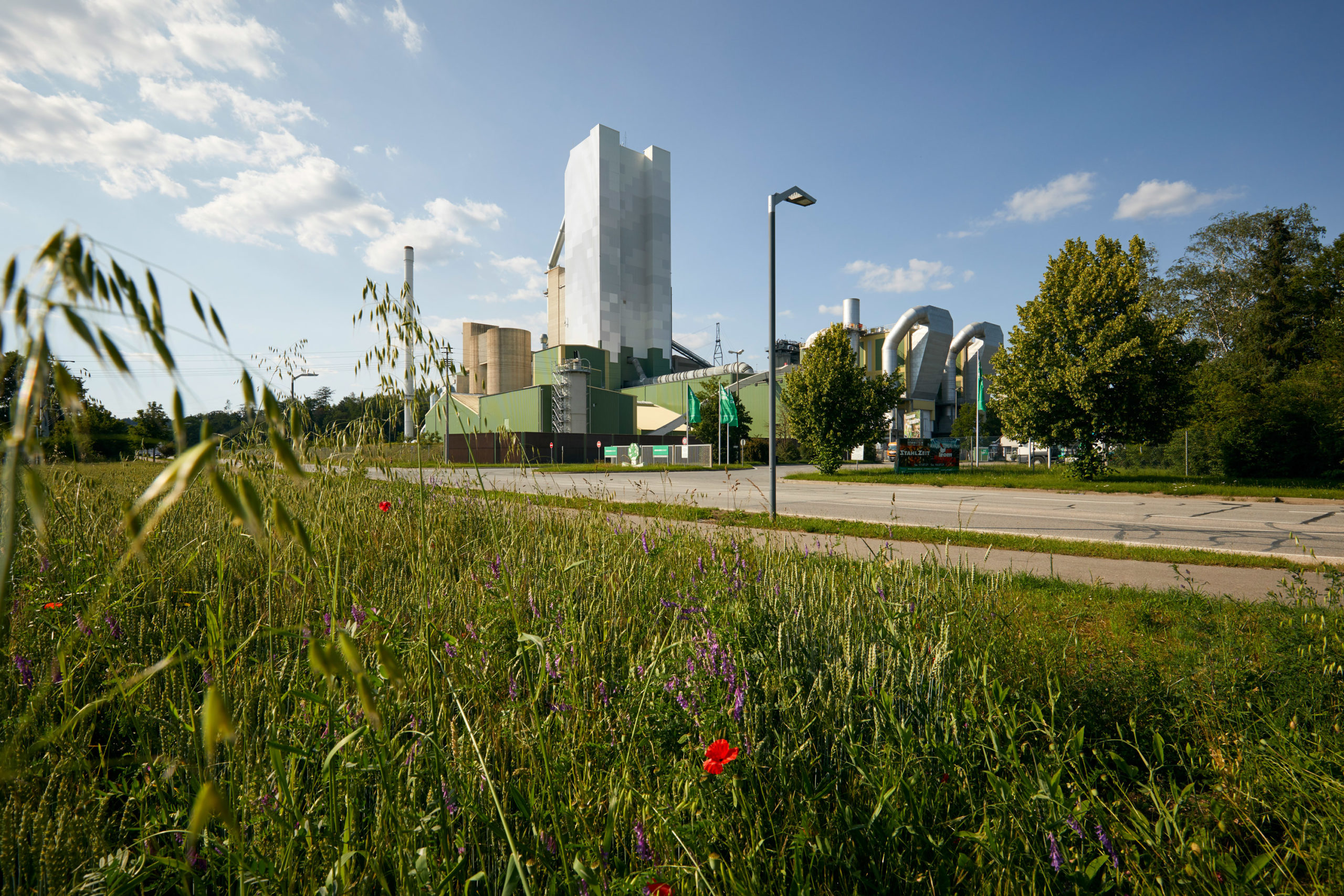 In Schelklingen hat man sich für eine einfarbige Fassade entschieden. Durch die Höhe von 140 m lag ein planerischer Schwerpunkt auf den zu treffenden Vorkehrungen für die Montage der Fassadenelemente und der Stahlunterkonstruktion. Um eine reibungslose Montage in dieser Höhe zu ermöglichen, kam neben einem üblichen Standgerüst, ein fahrbares Systemgerüst zum Einsatz.
