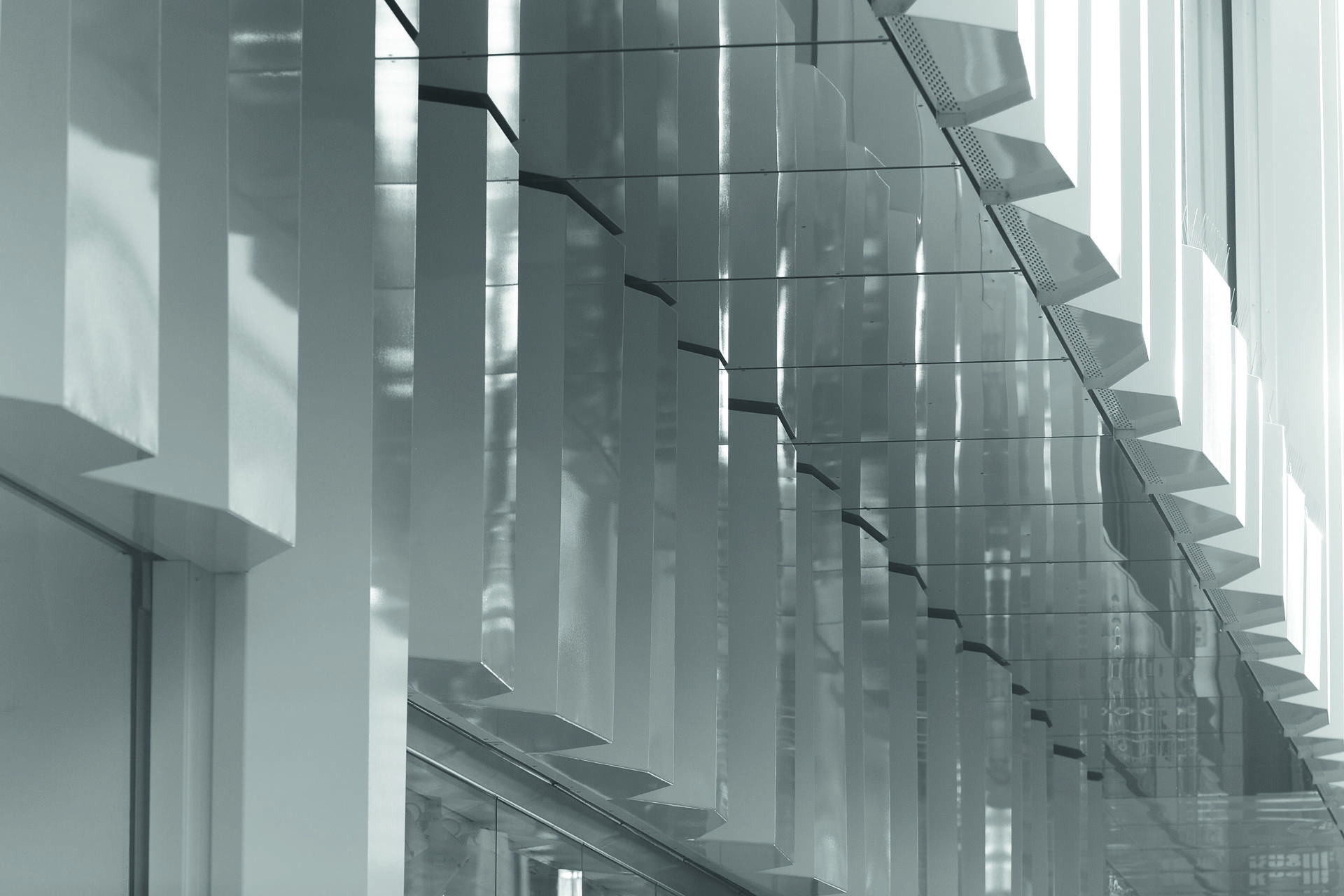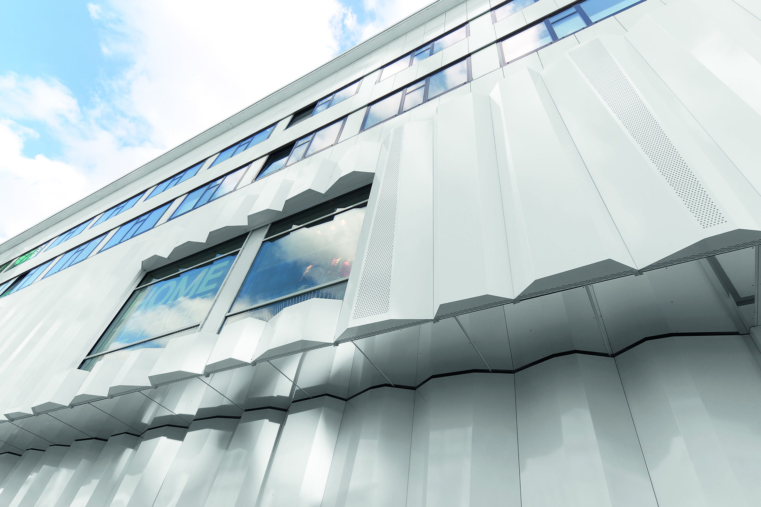 Die neue Aluminiumfassade (RoVisio FT) präsentiert sich modern und dynamisch wie der Modekonzern – ein optimaler Ausdruck der Corporate Architecture über die Fassadenelemente. Als zusätzlicher Blickfang wurden einzelne Elemente perforiert, um dahinter eine LED-Beleuchtung zu integrieren. Weiterhin sorgen die verspiegelten Unterdecken für Lichtreflexionen.