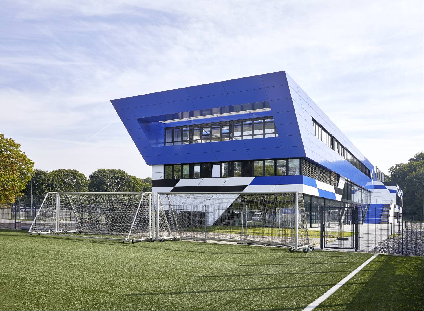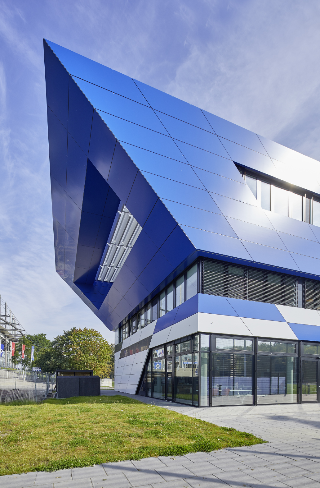 Die beleuchtete Dachmembran passt sich optisch an das Volksparkstadion an. Eine Photovoltaik-Anlage erzeugt 20 Prozent des Strombedarfs.
