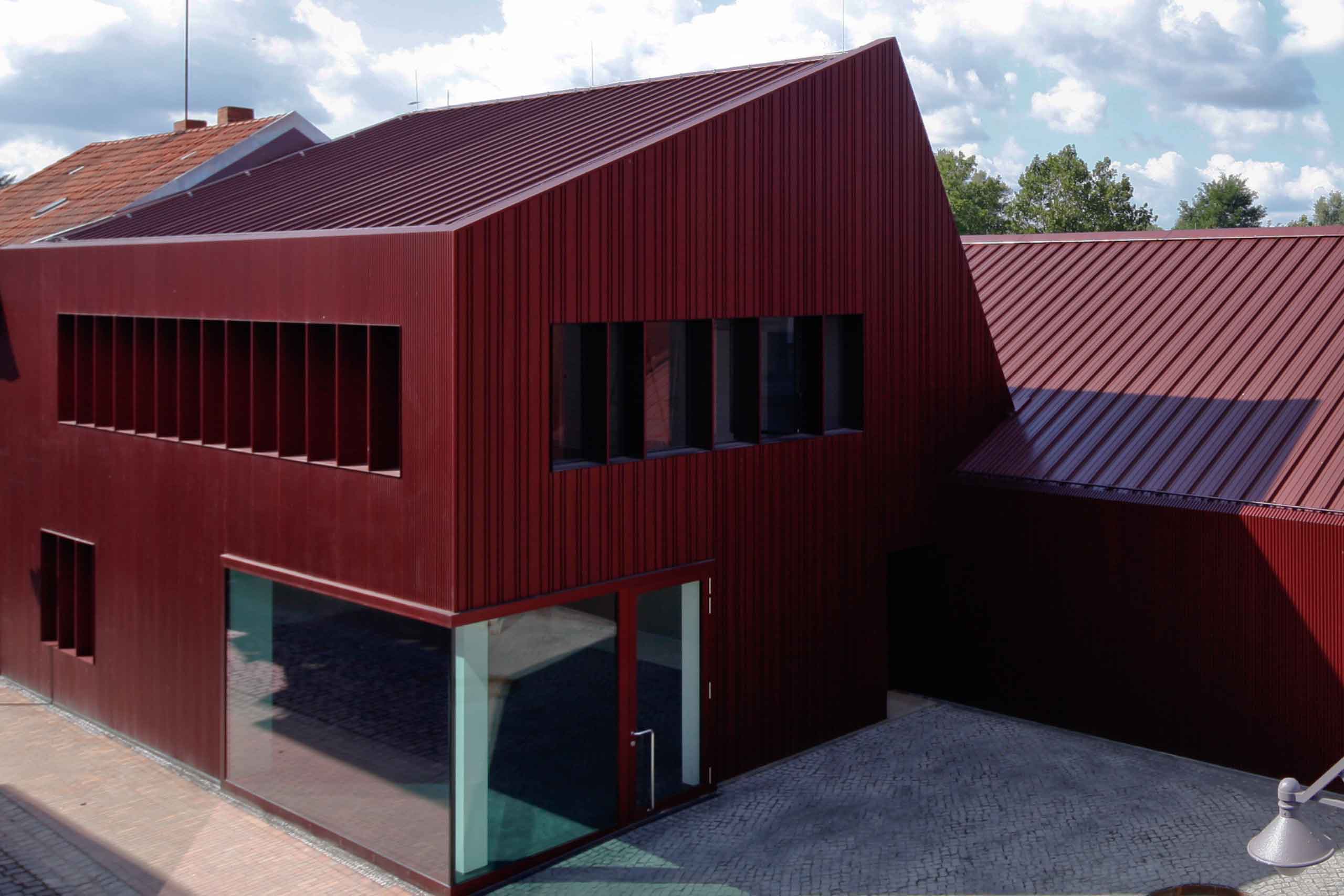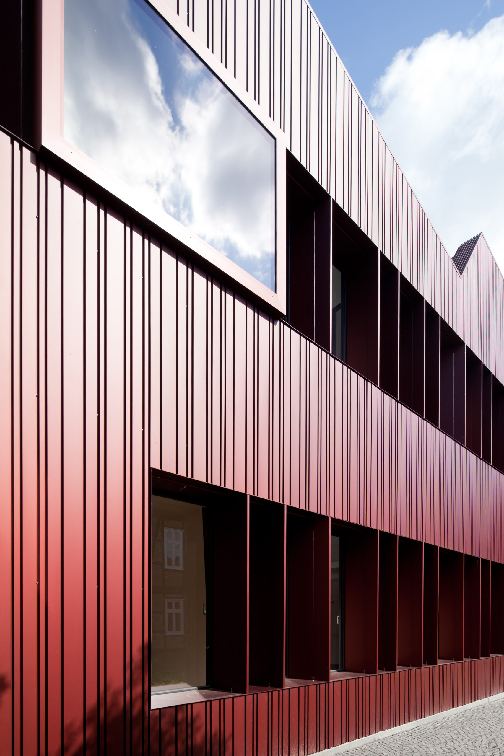 Die Außenhaut des Gebäudes besteht aus rötlich eloxierten Aluminium-Profilen, die maßgeschneidert produziert und einzeln gefaltet wurden.