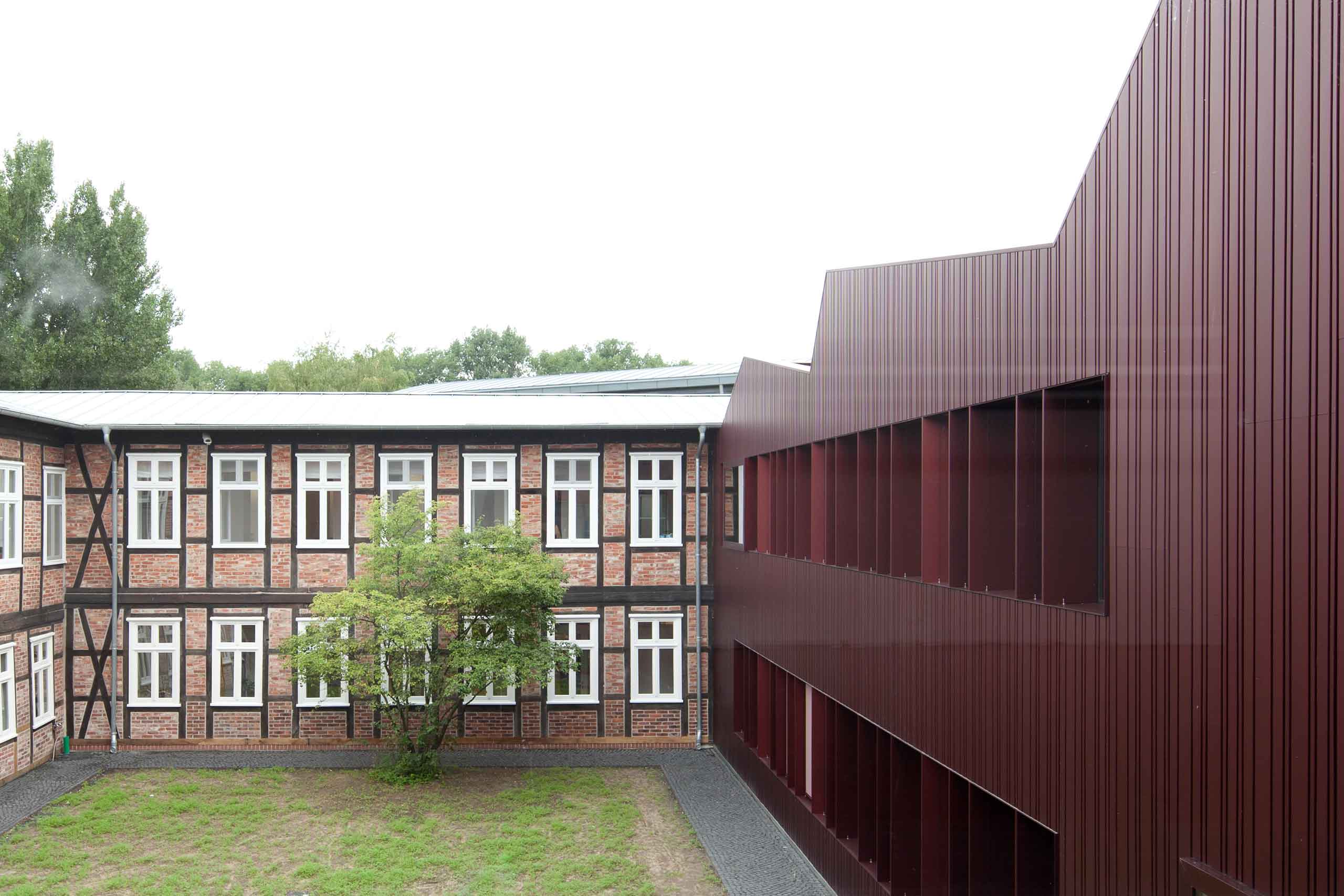 Die an plissierten Stoff erinnernde Anmutung stellt einen Bezug zur textilen Gestaltung im Innenraum sowie der farblichen Prägung der historischen Fassade in der dannenberger Altstadt her.