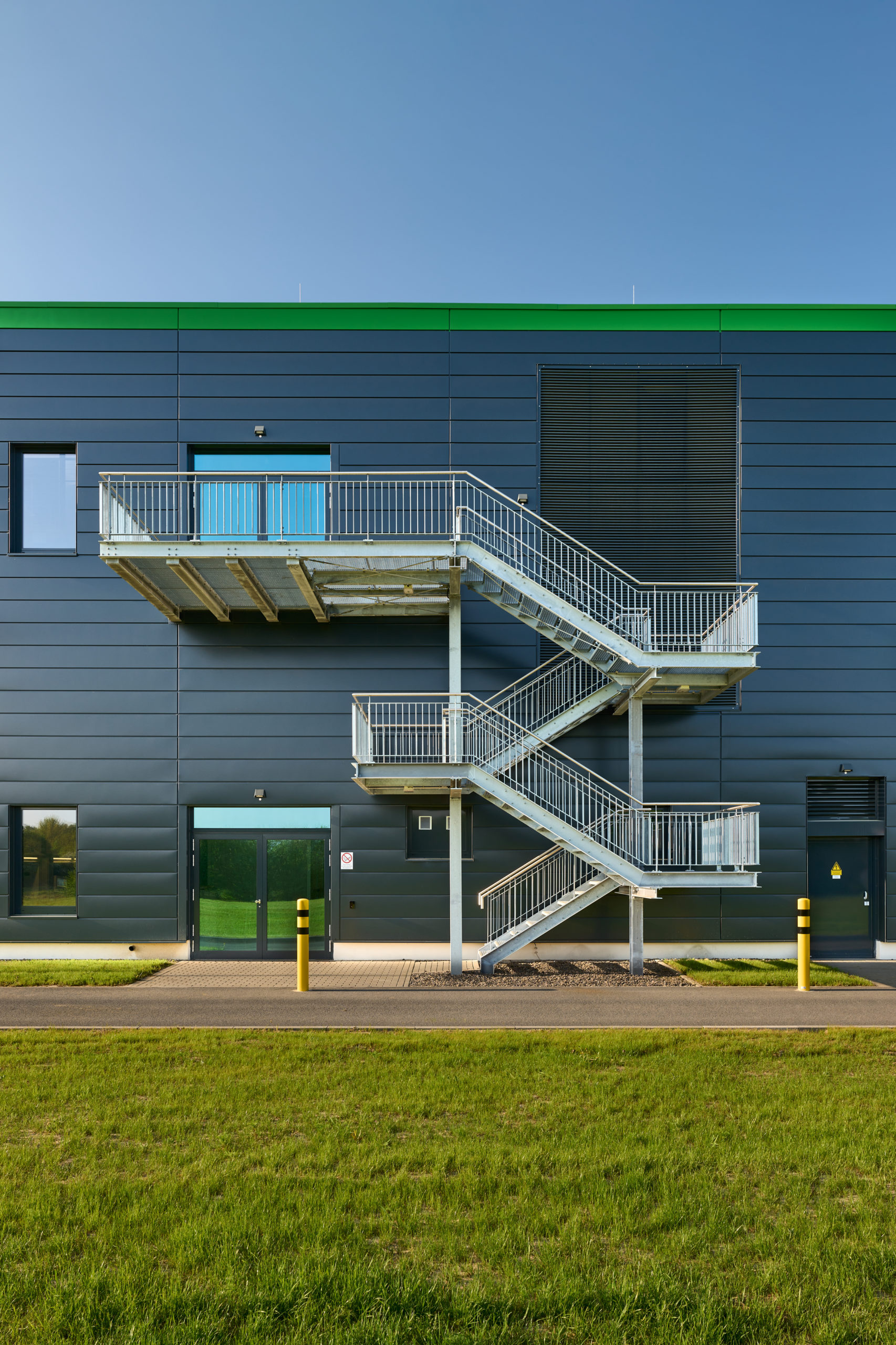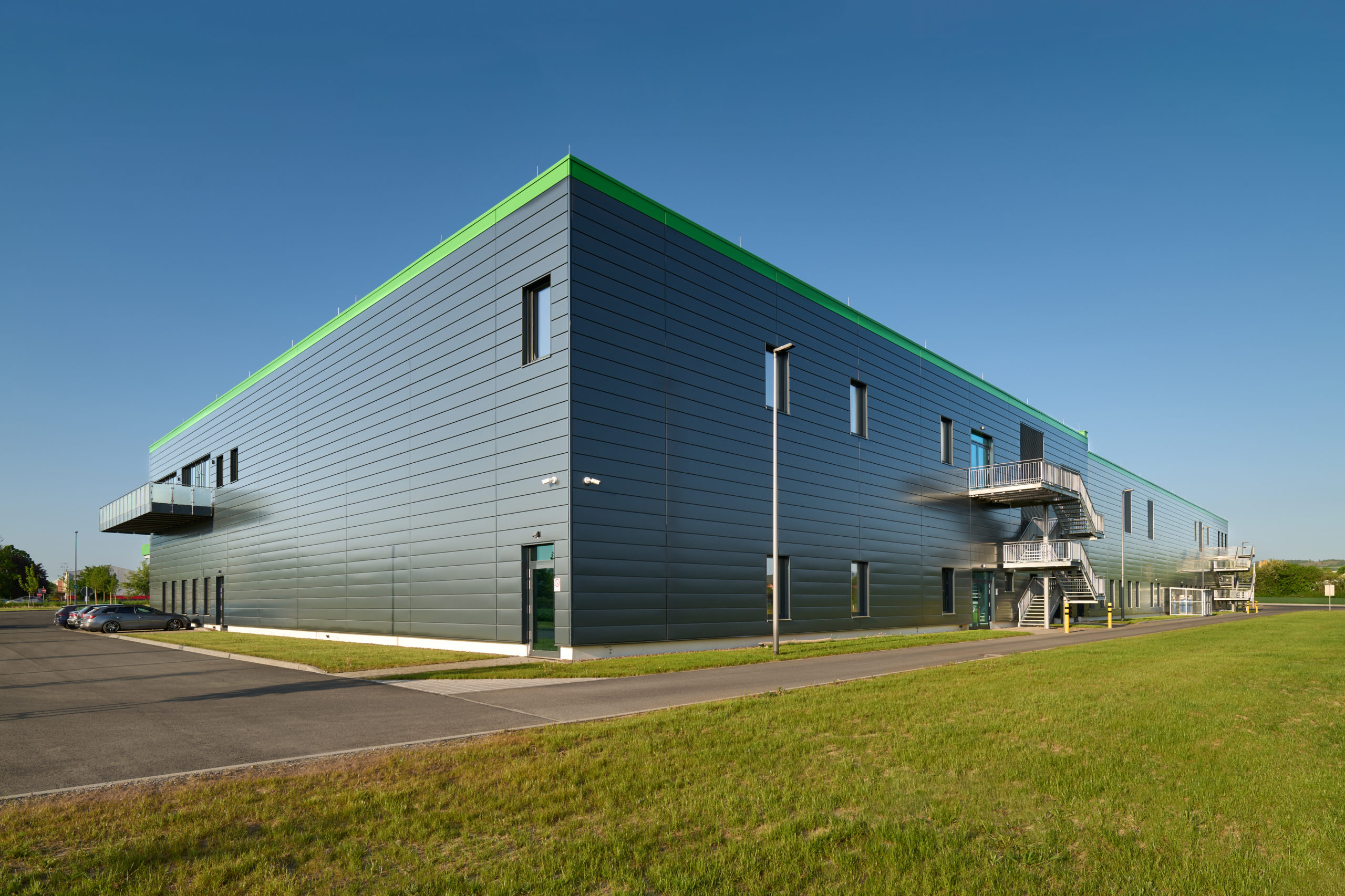 Neben der 3.600 m² großen Fassadenfläche, welche wir mit Langfeldpaneelen auf einer zweiteiligen, ausgleichbaren Unterkonstruktion ausführten, fertigten und montierten wir die Außentüren und ‑fenster aus Aluminium inklusive der passenden Raffstore.
