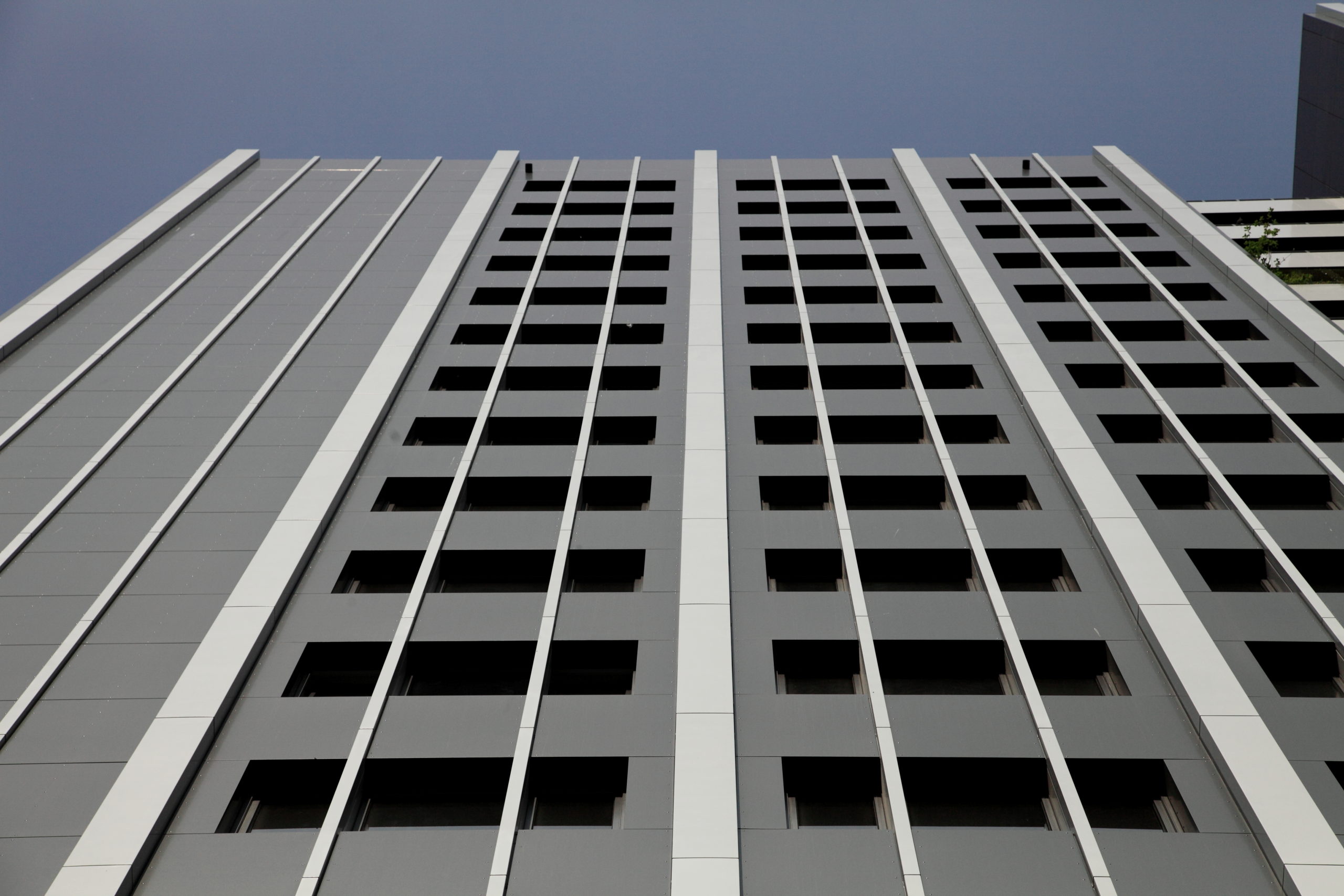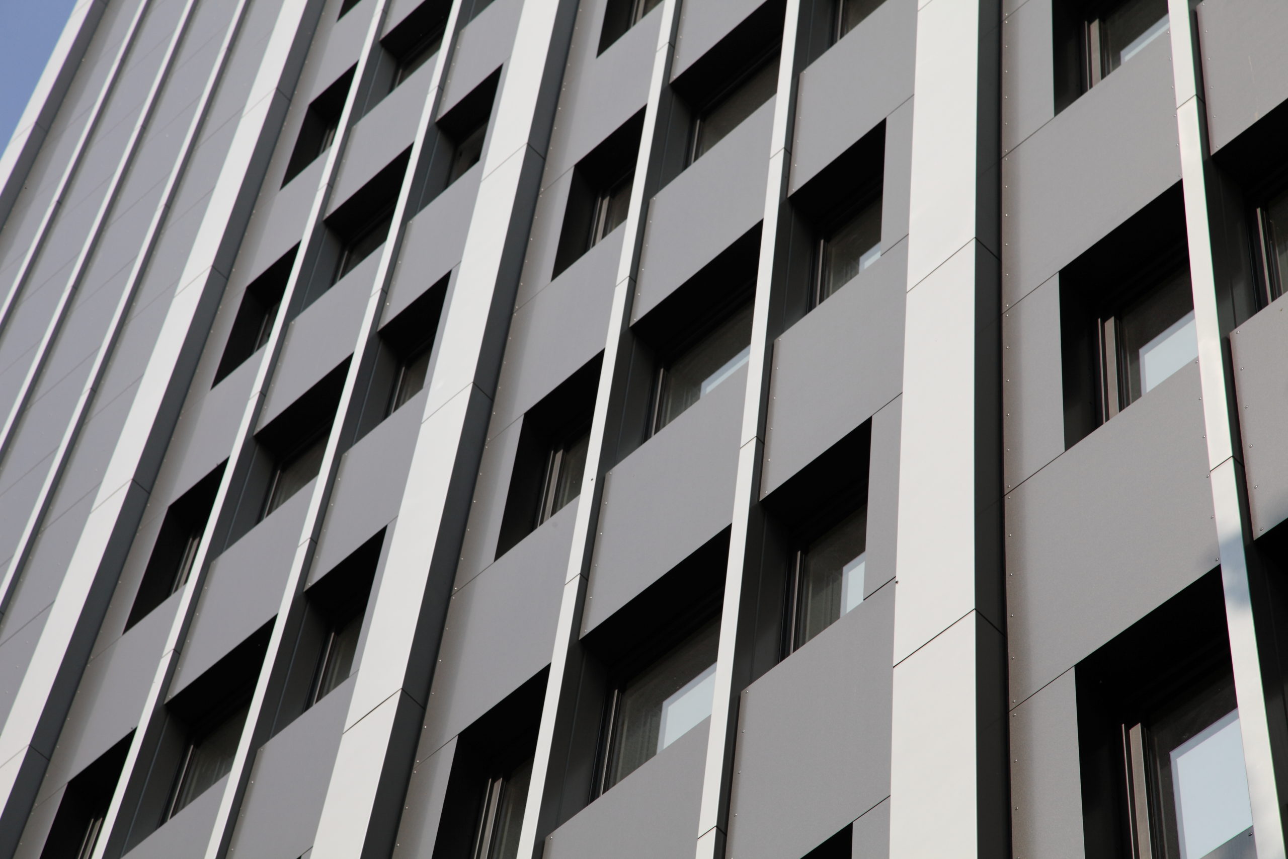 Die Lösung sah eine Metallfassade vor, die von außen die vorhandenen Betonplatten verkleidet. Dieses Projekt stellte besondere statische Anforderungen an das Fassadensystem. RONGE erarbeitete einen Plan für die Montagearbeiten, um das Fassadensystem optimal an dem tragfähigen Hintergrund zu verankern.